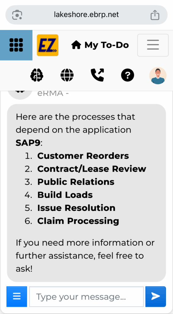 eRMA is not a generic chatbot. It’s built on the eBRP Process Model, trained using the actual architecture of your program: assets, services, plans, locations, RTOs, responders, impact thresholds, and more.